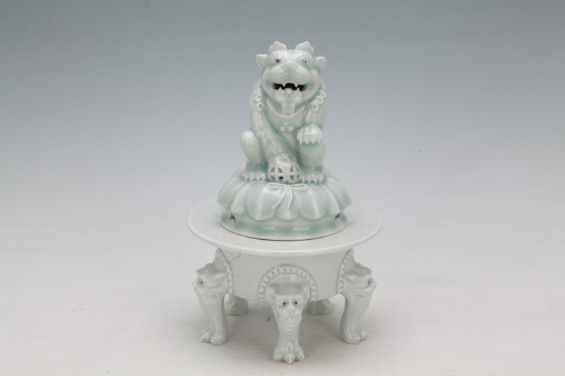青白釉狮盖兽足熏炉 宋代水东窑位于潮州城韩江东岸的韩山西侧,也称韩山窑,笔架山窑,是宋代潮州窑的代表。颐陶轩根据窑址标本仿制出这一青白釉狮盖兽足熏炉。