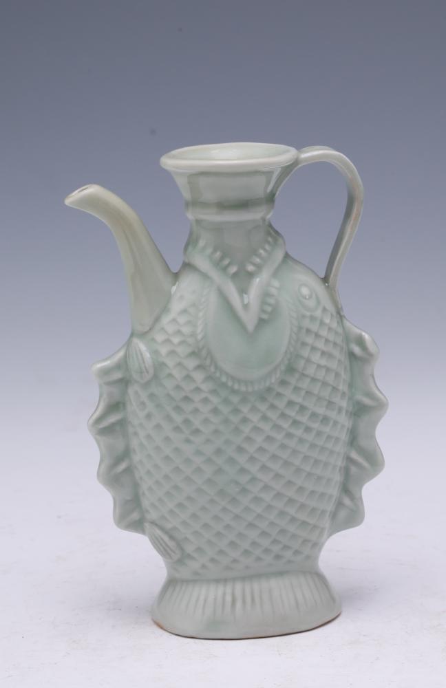 宋代潮州窑出土的鱼形壶 一说鲤鱼,一说为摩羯鱼。佛教《阿含经》称摩羯鱼:“眼如日月,鼻如太山,口如赤谷”,常在海里游逡,拯救将沉之船,被喻为水中菩萨。颐陶轩依形仿制。