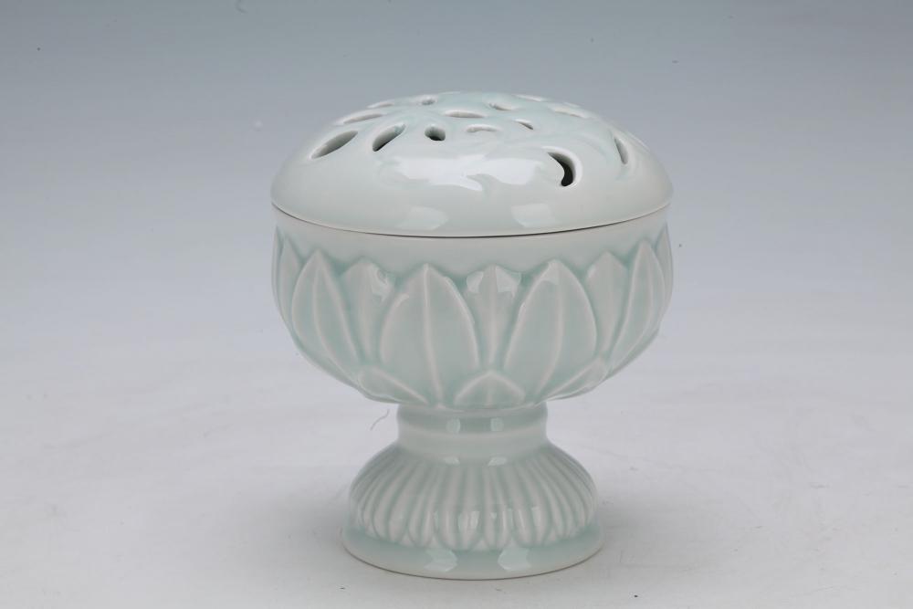 莲花薰炉 1922年10月,在潮州城西羊鼻冈发现宋代潮州窑莲花炉与四尊底座刻有铭文的佛像,分别藏于广东省博物馆和国家博物馆。颐陶轩根据出土莲花炉的器型,增设炉盖,成为莲花薰炉。