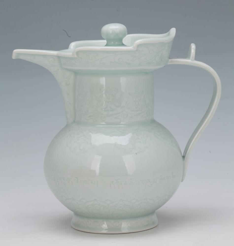 僧帽壶 是中国元代创制的壶式造型,因壶口形似僧帽而得名,具有强烈的少数民族风格。颐陶轩依古样仿制,器腹刻上藏文意为“昼吉祥、夜吉祥、正午吉祥、昼夜吉祥、三宝吉祥”。是吉祥题材的典型器。